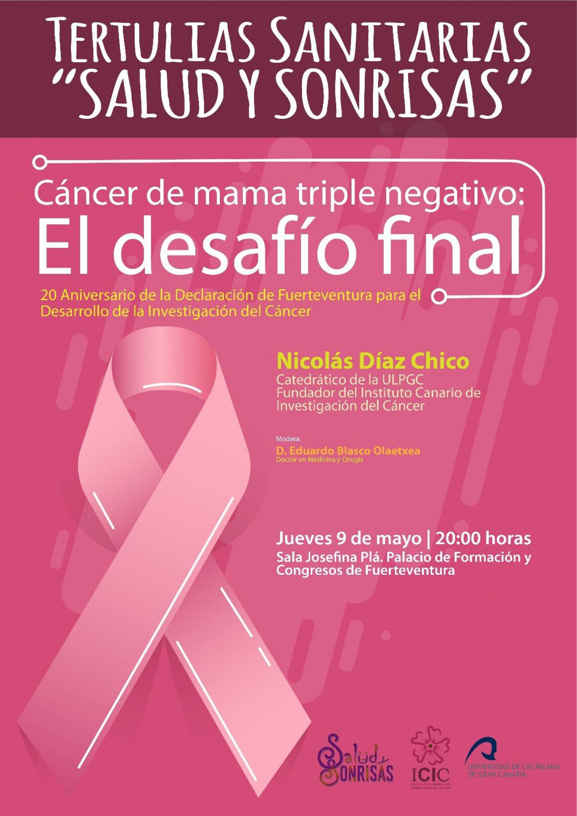 Ante el 20 aniversario de la Declaración de Fuerteventura para el desarrollo de la investigación del cáncer, la Asociación canaria Salud y Sonrisas en colaboración con el ICIC (Instituto Canario de Investigación del Cáncer) y la ULPGC (Universidad de las Palmas de Gran Canaria) ha organizado una conferencia, dentro de su programa de Tertulias Sanitarias Salud y Sonrisas.D. Nicolás Díaz Chico, Catedrático de la ULPGC y Fundador del Instituto Canario de Investigación del Cáncer, compartirá con todas las personas asistentes, su conferencia "Cáncer de mama triple negativo: El desafío final".