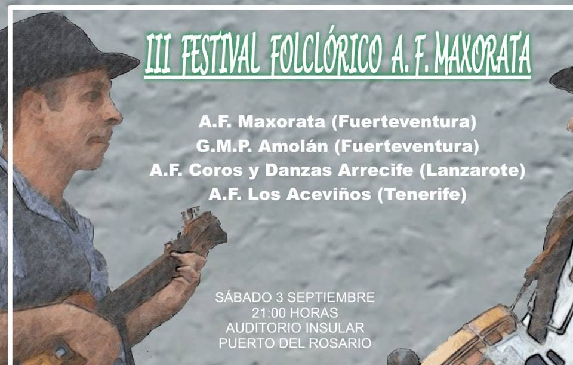 Se recupera el Festival desaparecido hace diez años con cartel de lujo para difrutar del mejor folklóre de calidad, la cita del III FESTIVAL A.F. MAXORATA es el próximo 3 de septiembre a las 21.00 horas, este evento tendrá lugar en el Auditorio Insular de Puerto del Rosario. El mejor cartel con los componentes del GMP Amolán, A.F.Coros y Danzas de Arrecife desde Lanzarote y la A.F. Los Aceviños desde la isla de Tenerife. Tienes una cita con el Folclore el 3 de septiembre. No faltes!
