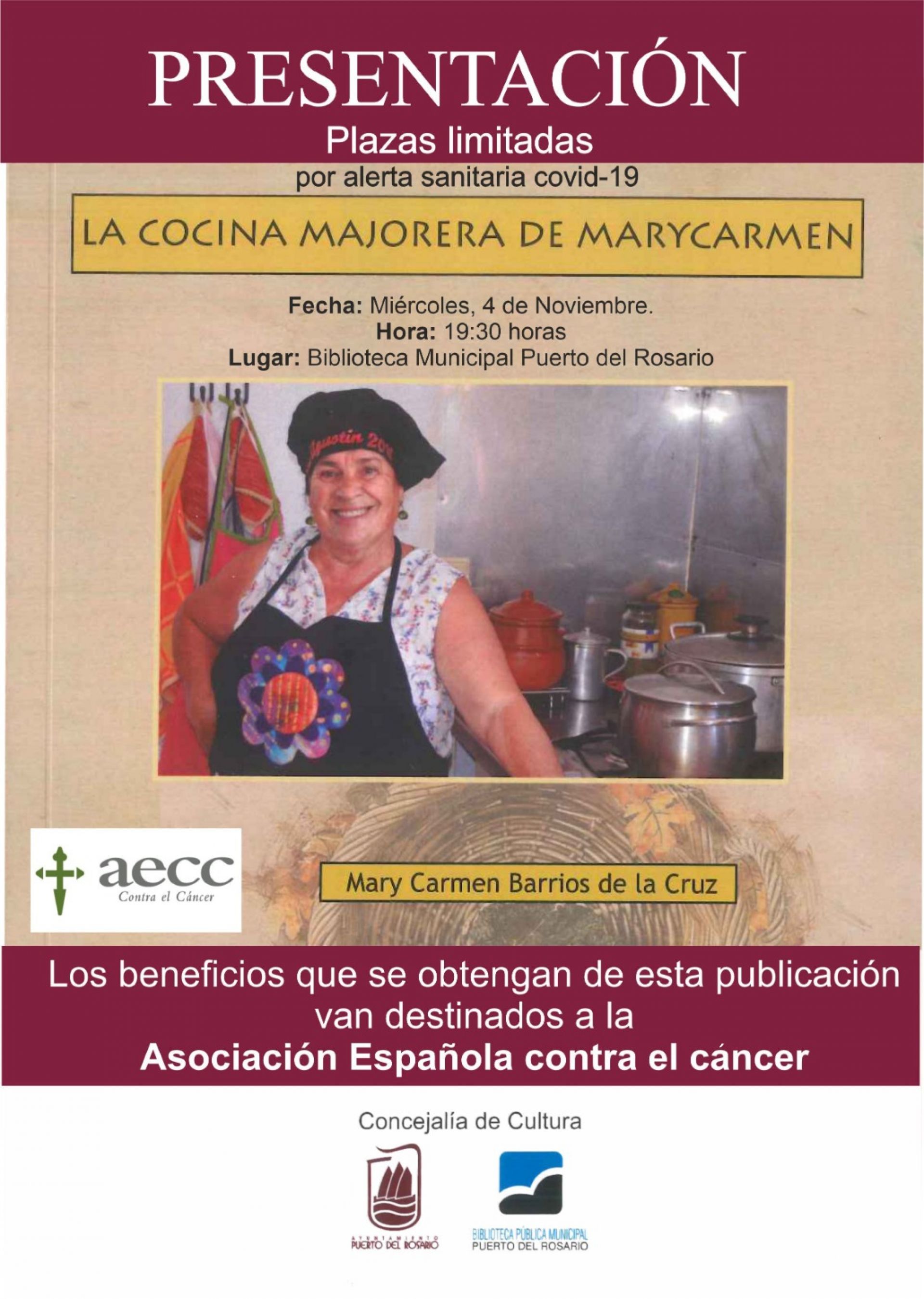 El alcalde del Ayuntamiento de Puerto del Rosario, Juan Jiménez, y la concejala de Cultura, Aurelia Vera, se complacen en invitar a la ciudadanía a la presentación del libro ‘La cocina majorera de Mary Carmen’, de la autora Mary Carmen Barrios de la Cruz, que tendrá lugar este miércoles, día 4 de noviembre, a las 19.30 horas, en la Biblioteca municipal de Puerto del Rosario.