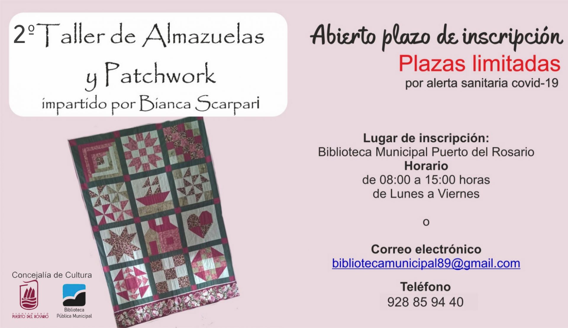 El Ayuntamiento capitalino, a través de la Concejalía de Cultura que dirige Aurelia Vera, comunica la apertura del plazo de inscripción para la 2ª edición del taller de patchwork y almazuelas en la Casa de la Cultura de Puerto del Rosario, tras el éxito de la primera edición que solo pudo acoger un número limitado de plazas bajo protocolo sanitario frente al covid-19.