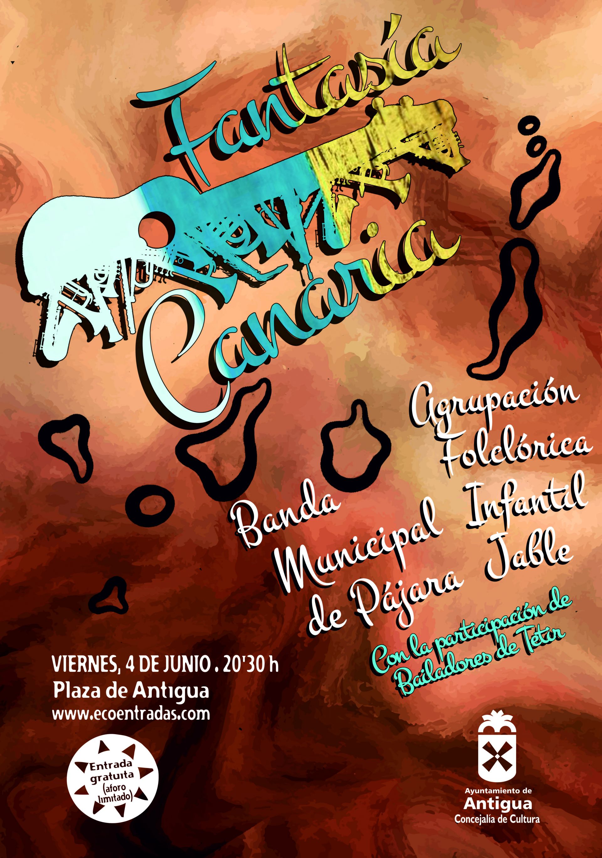 El Ayuntamiento de Antigua desde la concejalía de Cultura, ofrece este viernes 4 de junio a las 20:30 horas en la plaza de Antigua, el espectáculo Fantasía Canaria con las actuaciones de la Banda Municipal de Pájara y la Agrupación Folclórica Infantil Jable y la participación de Bailadores de Tetir.