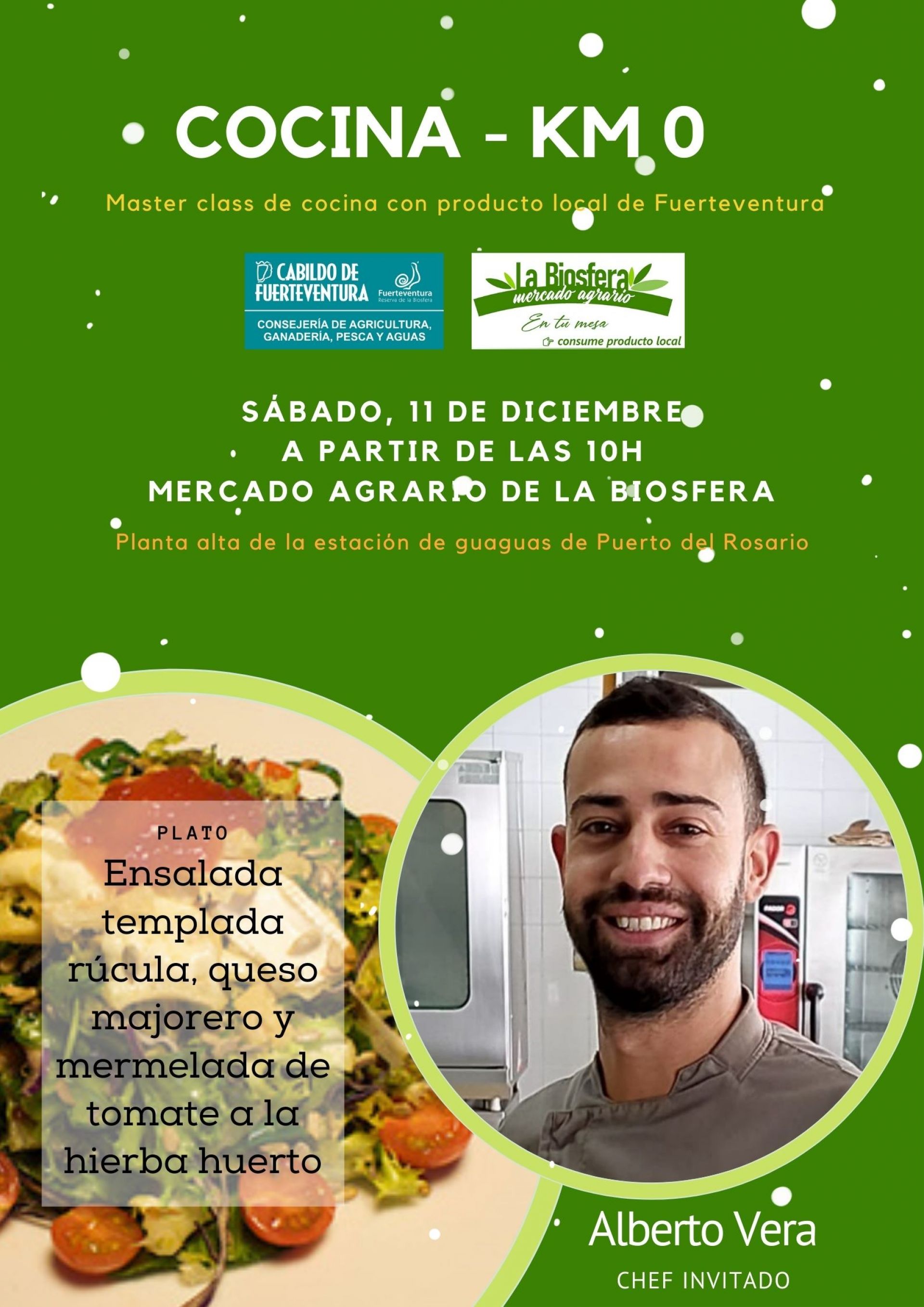 El Mercado Agrario de la Biosfera ha dado comienzo a su programación navideña con sorteos y actividades para llevar a los consumidores y consumidoras lo mejor del producto local en estas fechas tan señaladas. Este sábado, día 11 de noviembre, a partir de las 10.00 horas, será el turno de la masterclass del chef Alberto Vera, de Las Otras Naves, quien preparará un plato de ensalada templada de rúcula, queso majorero y mermelada de tomate a la hierba huerto.