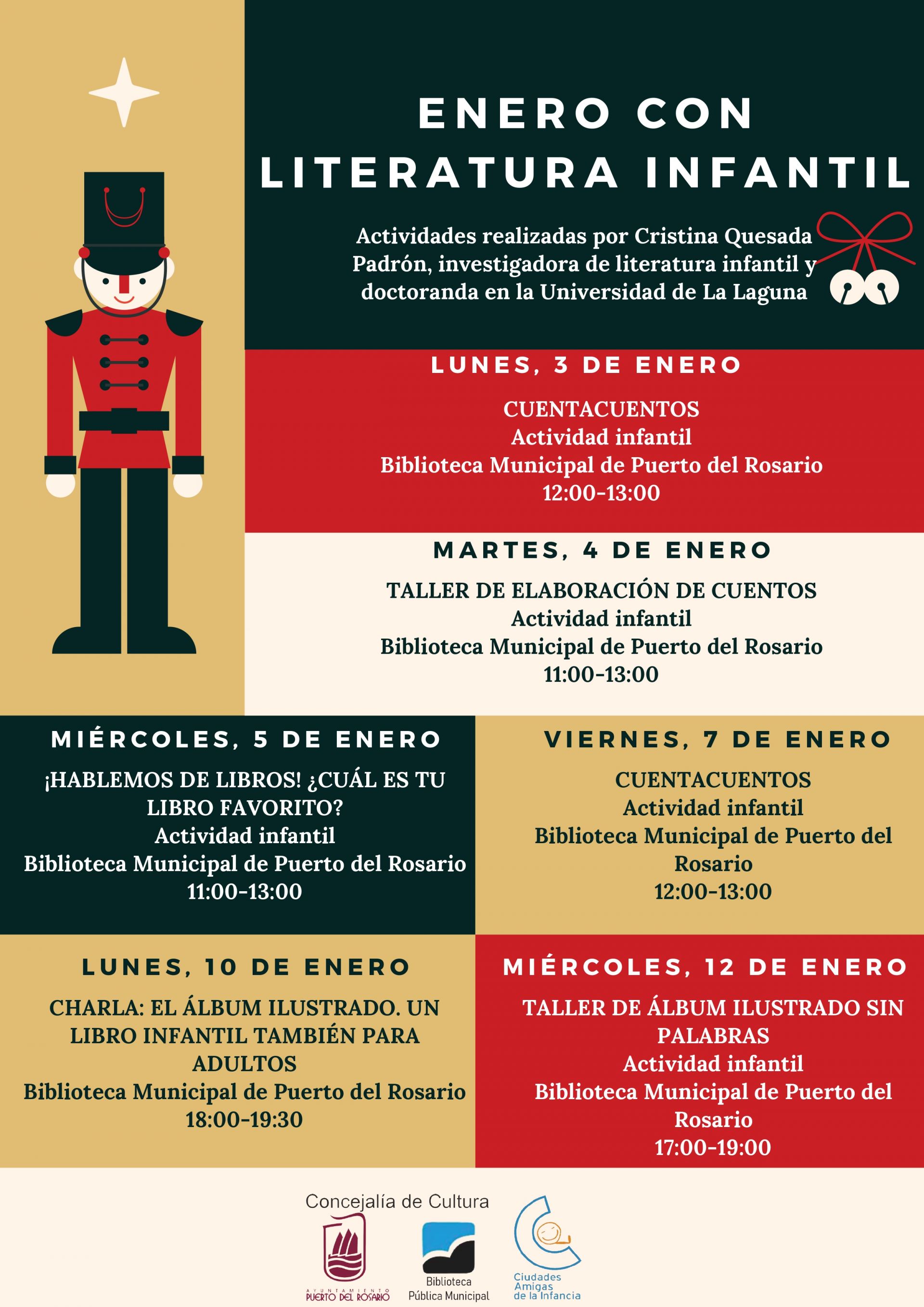 Por su parte, el miércoles, día 5, se impartirá la actividad ‘¡Hablemos de libros! ¿Cuál es tu libro favorito?’ también en horario de 11.00 a 13.00 horas, y el día 10 de enero, la Biblioteca de Puerto del Rosario acogerá de 18.00 a 19.30 horas una charla dirigida a madres, padres, familias, docentes y, en definitiva, mediadores y cualquier persona interesada, que suelen ser las que actúan de mediadores durante la lectura con los niños y las niñas, bajo el título ‘El álbum ilustrado. Un libro infantil también para adultos’.