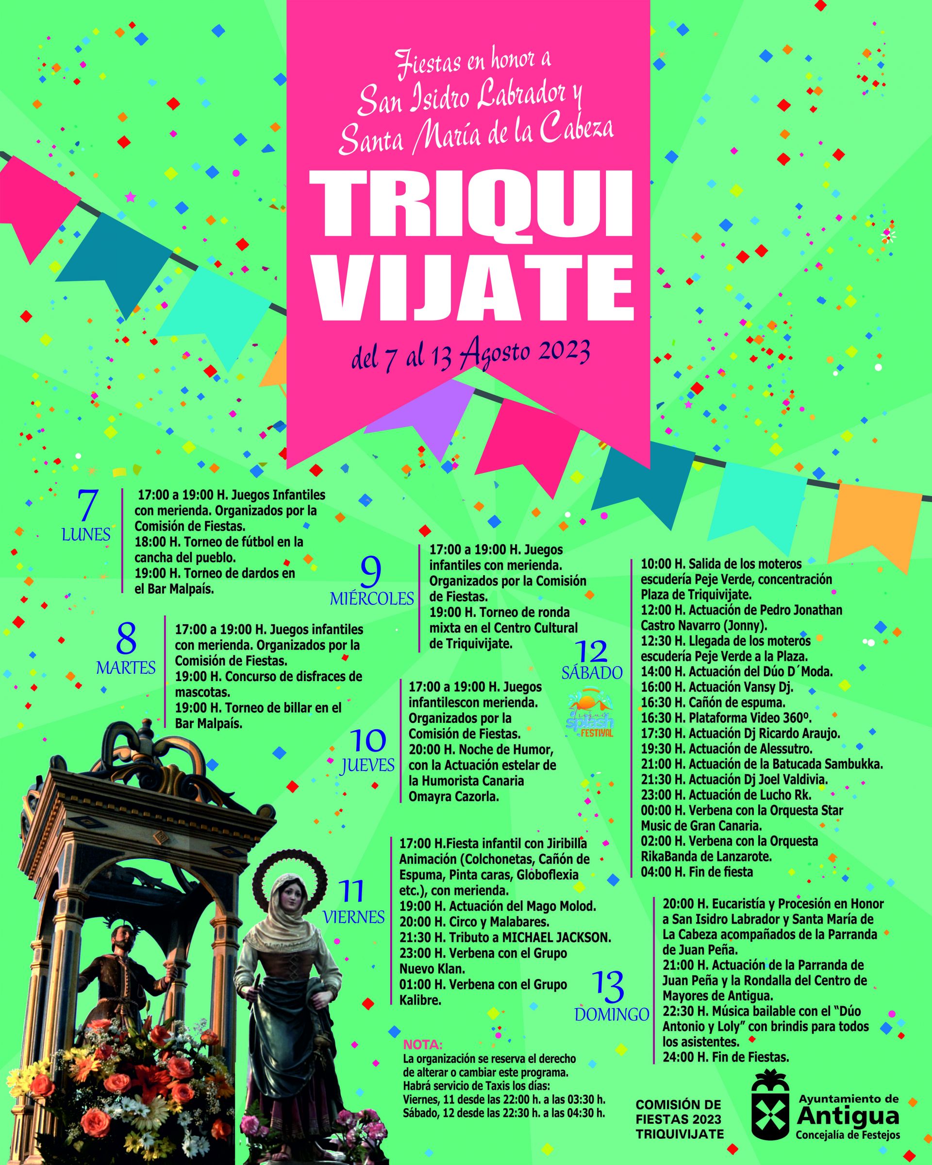 El Ayuntamiento de Antigua desde la concejalía de Festejos y la Comisión de Fiestas anuncian las Fiestas de Triquivijate en Honor a San Isidro Labrador y Santa María de La Cabeza desde el lunes 7 al domingo 13 de agosto, señala el alcalde, Matías Peña García.