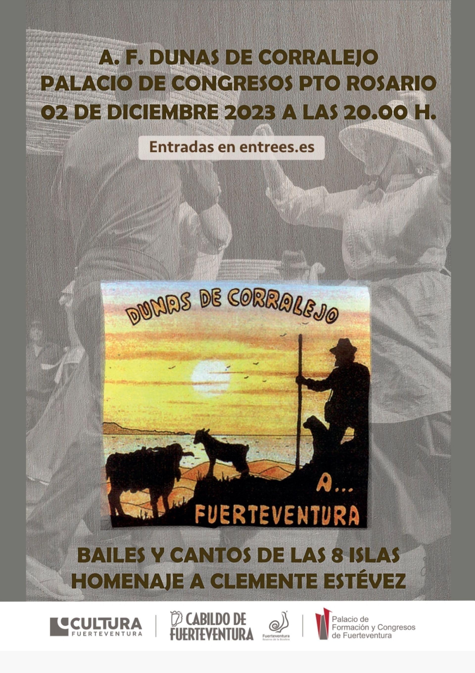 El Palacio de Formación y Congresos de Fuerteventura acogerá el próximo sábado, 2 de diciembre, a las 20.00 horas, la presentación del proyecto ‘Bailes y Cantos de las 8 Islas’ de la Agrupación Folclórica Dunas de Corralejo y llevarán a cabo un homenaje al compositor majorero Clemente Estévez.