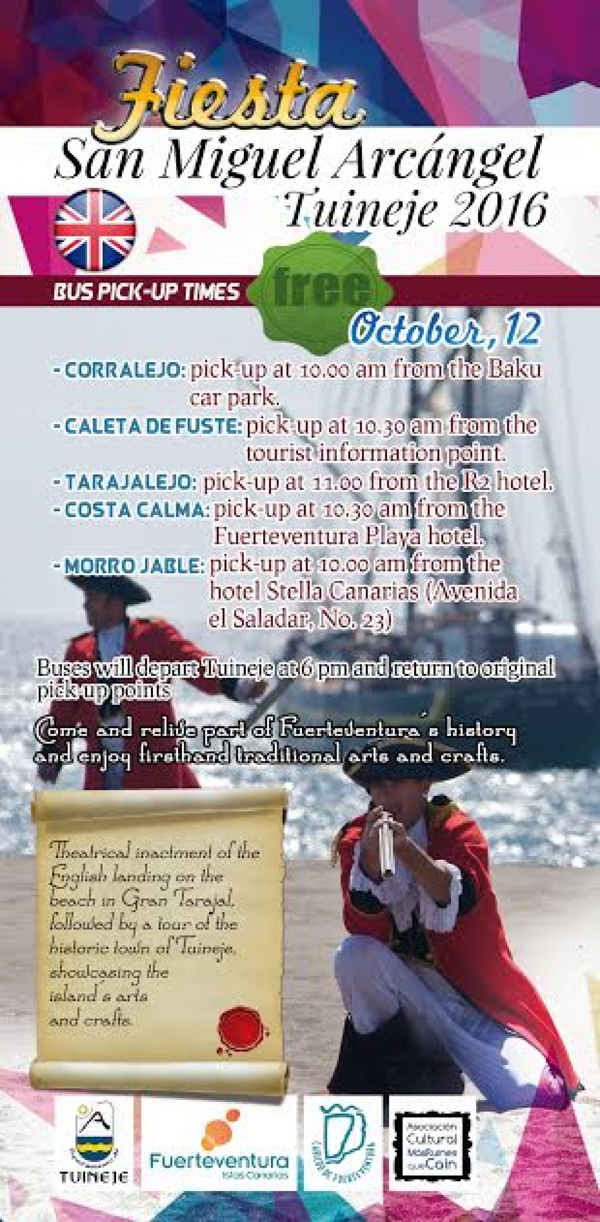 El Patronato de Turismo de Fuerteventura se llevará de excursión a los turistas que lo deseen el próximo 12 de octubre a Gran Tarajal. La intención del Patronato es que los visitantes extranjeros, que esos días se encuentren en la isla, puedan ver la recreación del desembarco de los corsarios ingleses en la playa de Gran Tarajal dentro de los actos de las Fiestas Juradas de San Miguel Arcángel.