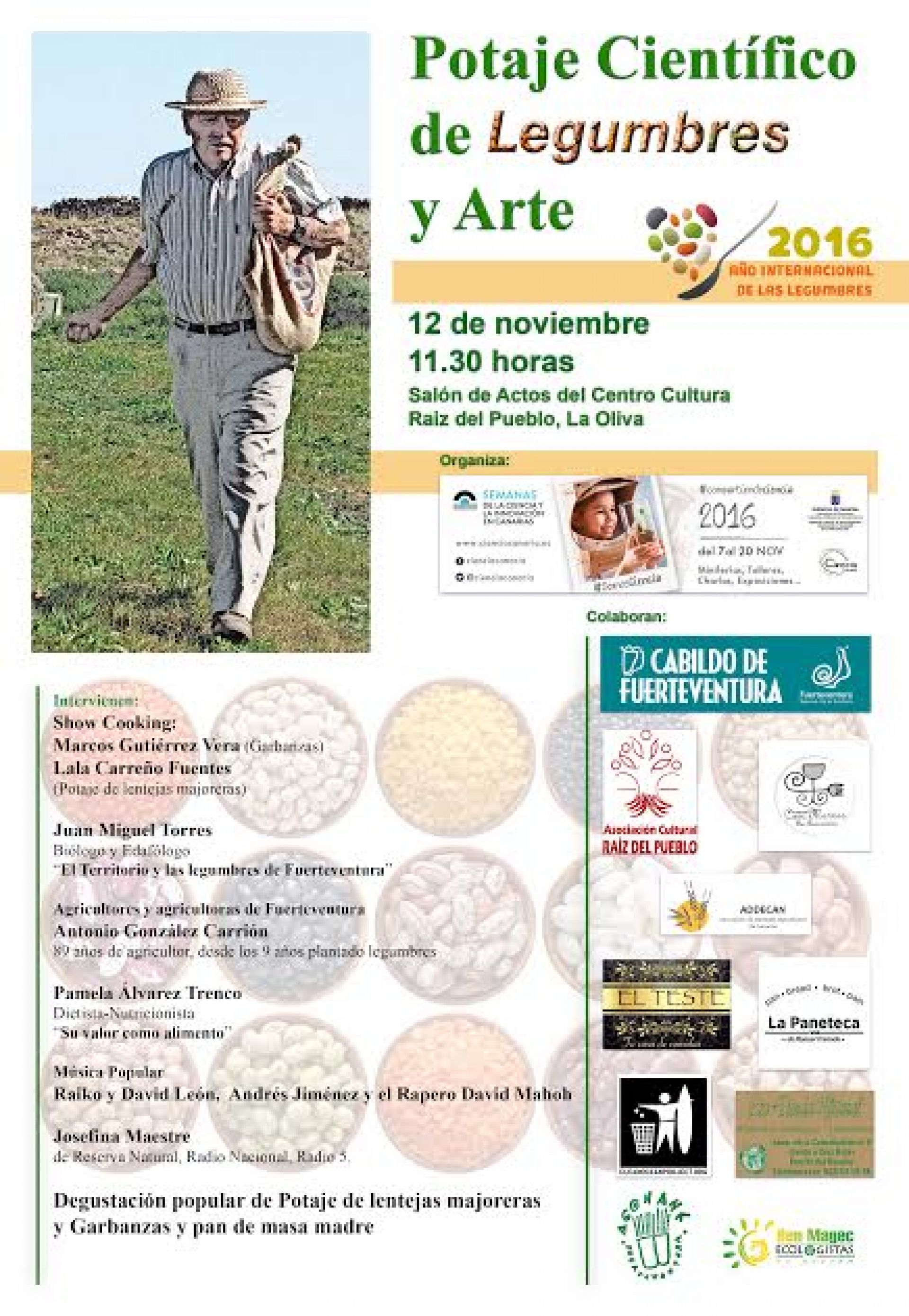 El profesor Juan Miguel Torres, biólogo y Edafólogo, un experto en gavias nos hablará del “Territorio y las legumbres de Fuerteventura”. Agricultores y agricultoras de la isla tomarán la palabra y hablarán de sus experiencias. Entre los sabios de la tierra, Antonio González Carrión, de 89 años y agricultor desde los 9 años, que nos explicará cómo y cuando se siembran las legumbres.