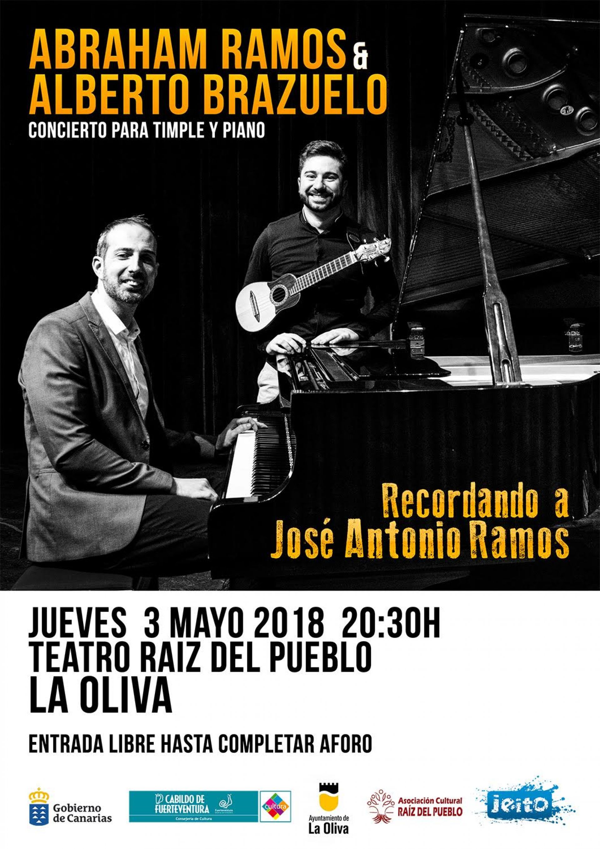Los músicos Abraham Ramos y Alberto Brazuelo realizan este jueves, 3 de mayo, un homenaje al timplista José Antonio Ramos con un concierto de timple y piano. El evento tendrá lugar a las 20.30 horas, en el Teatro Raíz del Pueblo de La Oliva, dentro de las actividades que forman parte de la Agenda Cultural del Cabildo de Fuerteventura, que coordina Juan Jiménez.