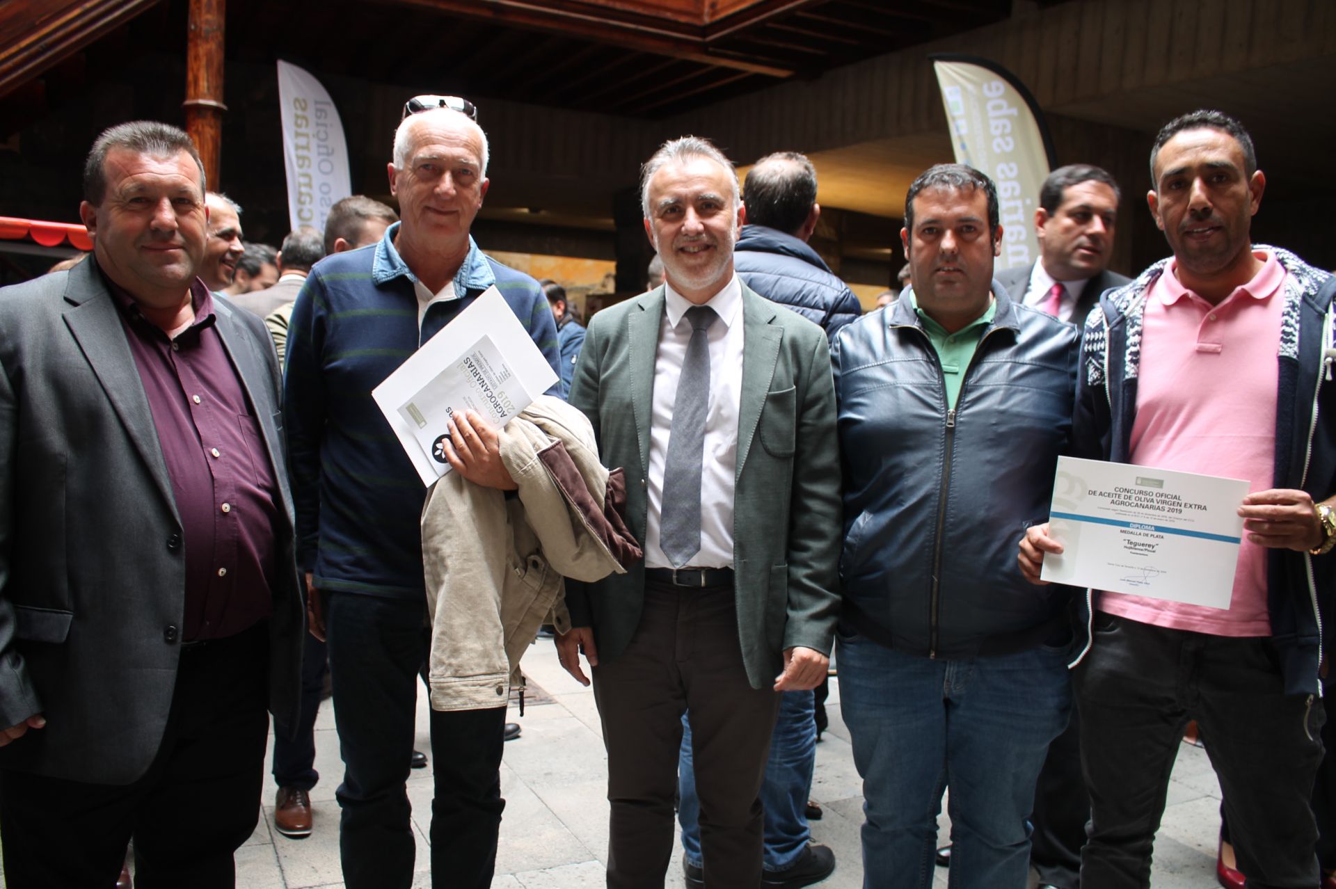 El alcalde, Matías Peña y el concejal de Agricultura, Ganadería y Pesca de Antigua, Fernando Estupiñán, acompañaron este viernes a los productores del municipio, Juan José Armas de El Esparragal en Valles de Ortega y Juan Manuel Rodríguez Lemes de las Salinas del Carmen, que recibieron la Medalla de Oro al mejor aceite de oliva extra de Canarias y Medallas de Plata Flor de Sal y Sal Marina, respectivamente.