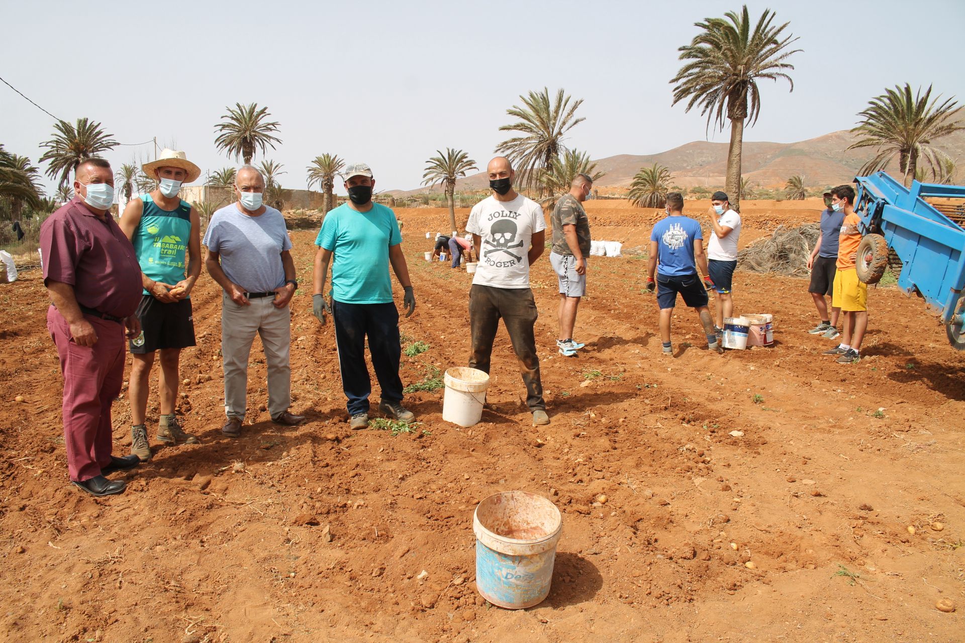 El alcalde de Antigua, Matías Peña, no ha querido perderse la cita en la que más de una veintena de jóvenes quedaban en la gavia de pozo verde para recoger las papas en un terreno cedido por el vecino José Melián y regada con el agua del pozo de Carlos Vera.