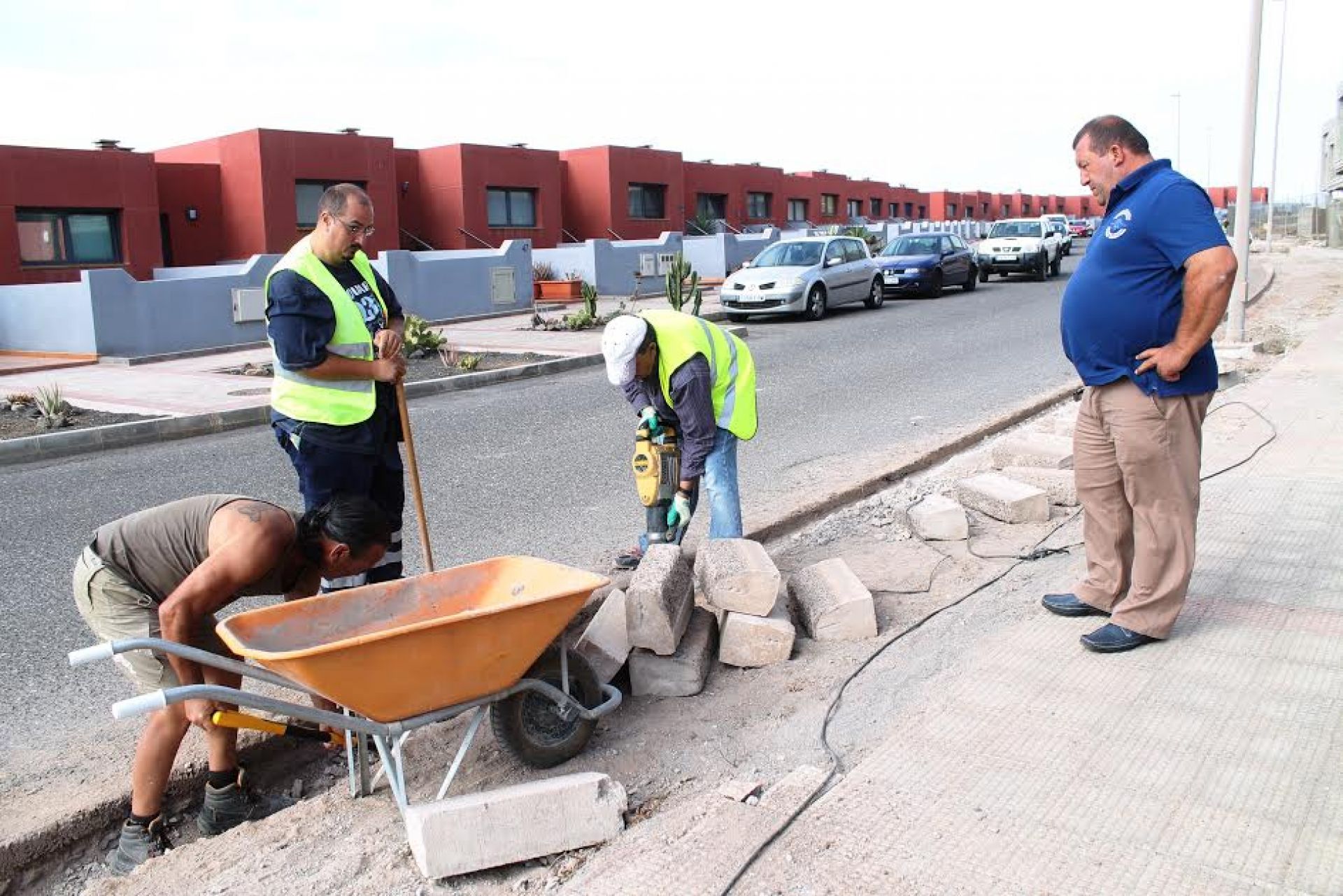 La intervención se realiza sobre 300 metros lineales de acera tras retirar los escombros que se acumulaban sobre el pavimento. Cinco operarios municipales reparan las zonas deterioradas en el pavimento de la acera, retirando completamente el bordillo para sustituirlo por uno nuevo que linde con una zona lineal ajardinada de un metro de ancho, que reemplazará al actual terreno abandonado que bordea la acera a lo largo de toda la calle.