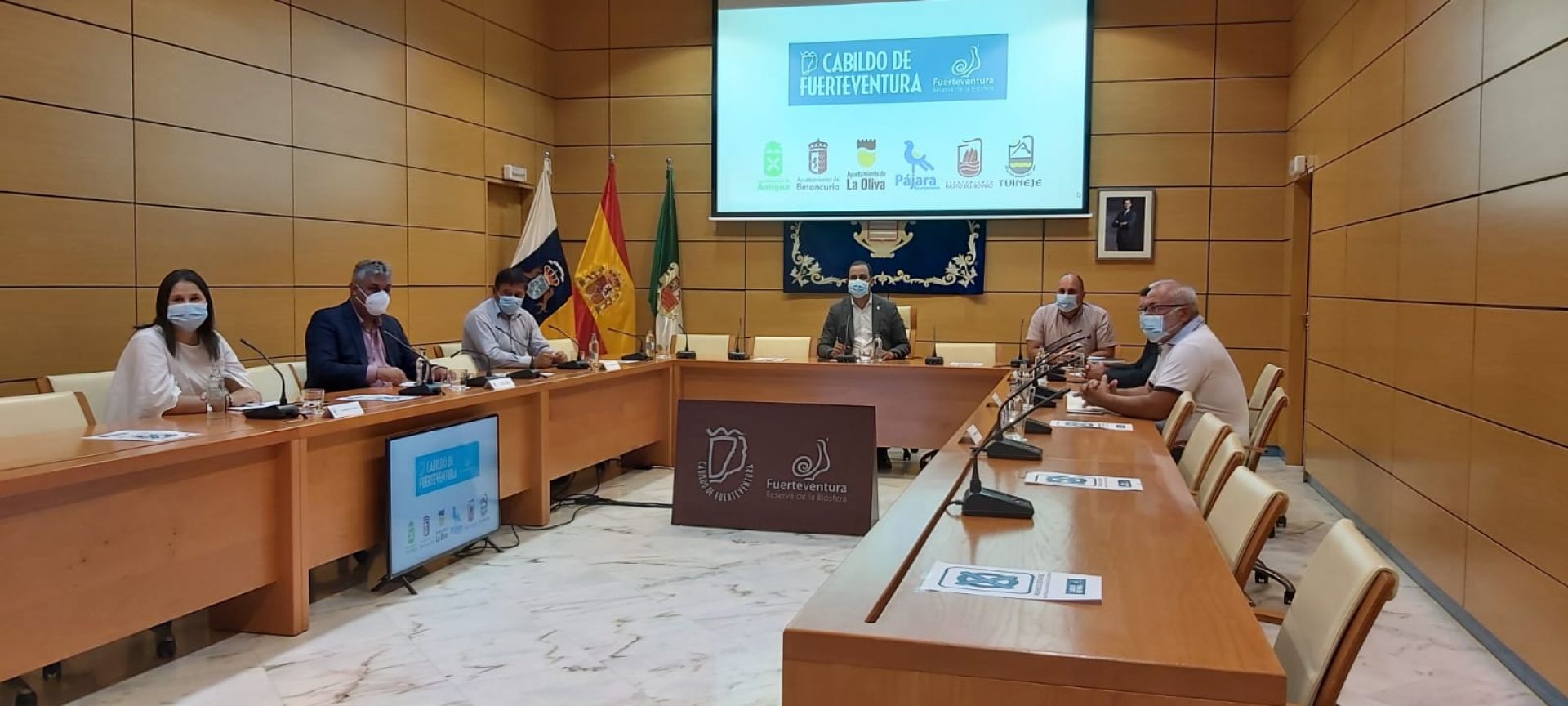 El presidente del Cabildo de Fuerteventura, Blas Acosta, y el consejero insular de Ordenación del Territorio y Coordinación con los Municipios, Sergio Lloret, se reunieron hoy, miércoles, día 24 de junio, con los alcaldes de los seis ayuntamientos para abordar la situación de las acampadas en la Isla.