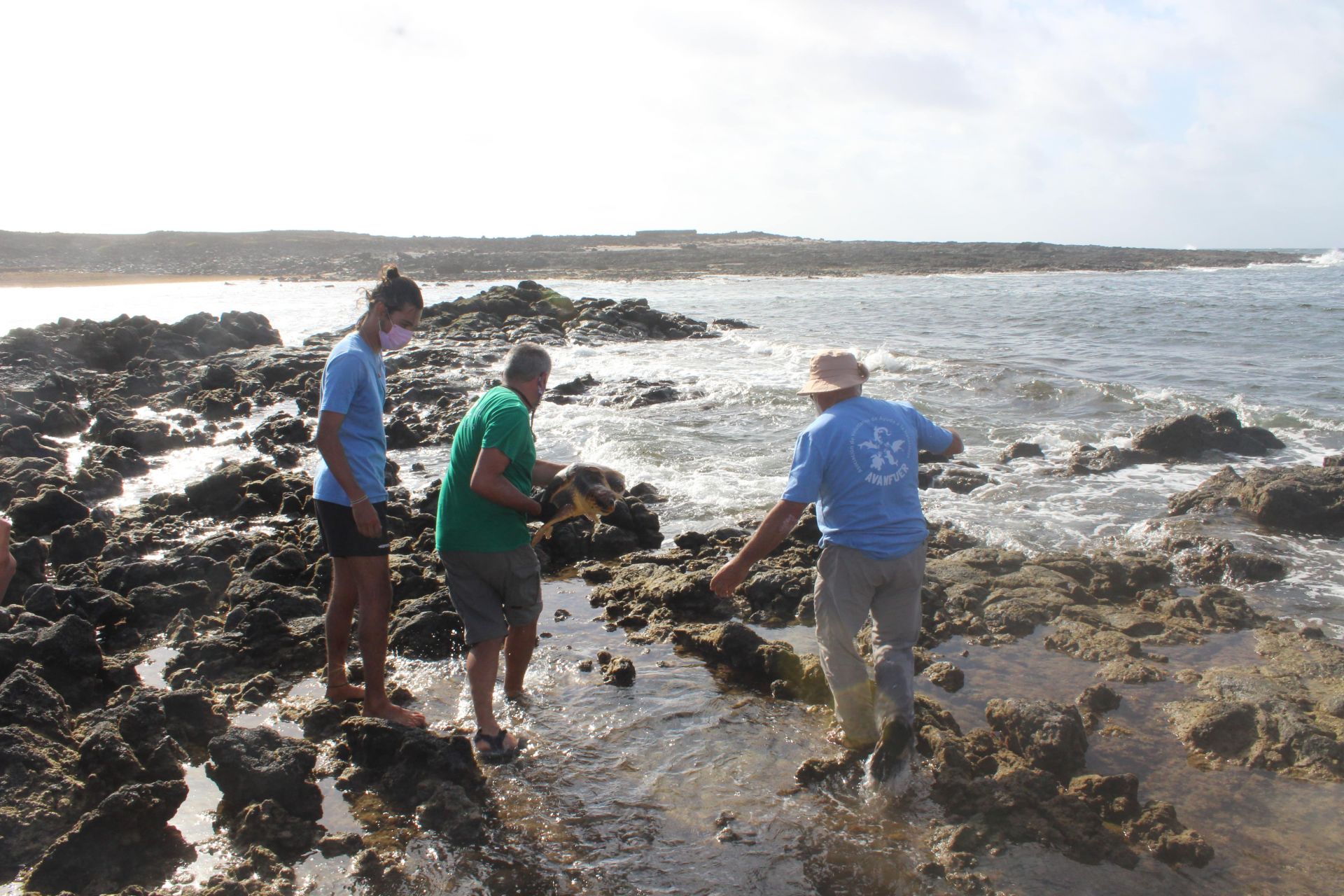 El Cabildo de Fuerteventura libera un ejemplar recuperado de tortuga boba ante la presencia de voluntarios ambientales