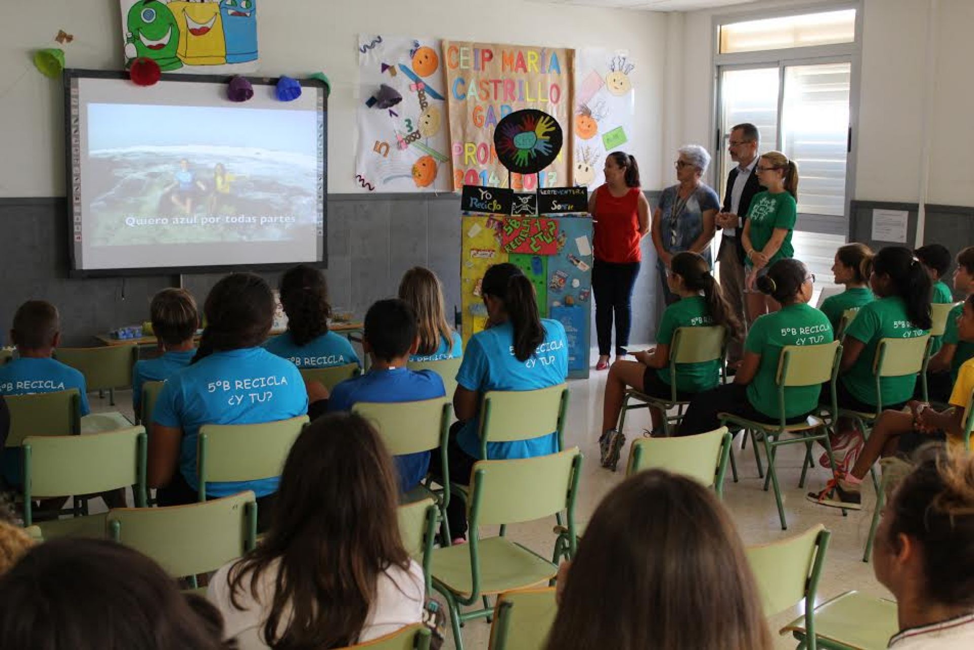 El Cabildo de Fuerteventura utilizará el vídeo realizado por escolares del CEIP María Castrillo, de Corralejo, en la próxima campaña de concienciación del reciclaje en la Isla. El presidente de la Corporación insular, Marcial Morales, y la consejera de Residuos, Luisa Ramos, junto a la directora del centro educativo, Juan Rosa Naranjo Santana, mostraron hoy, jueves, día 22 de junio, a la comunidad educativa el vídeo que la Institución utilizará después de haber mejorado el sonido de grabación y la calidad de las imágenes.