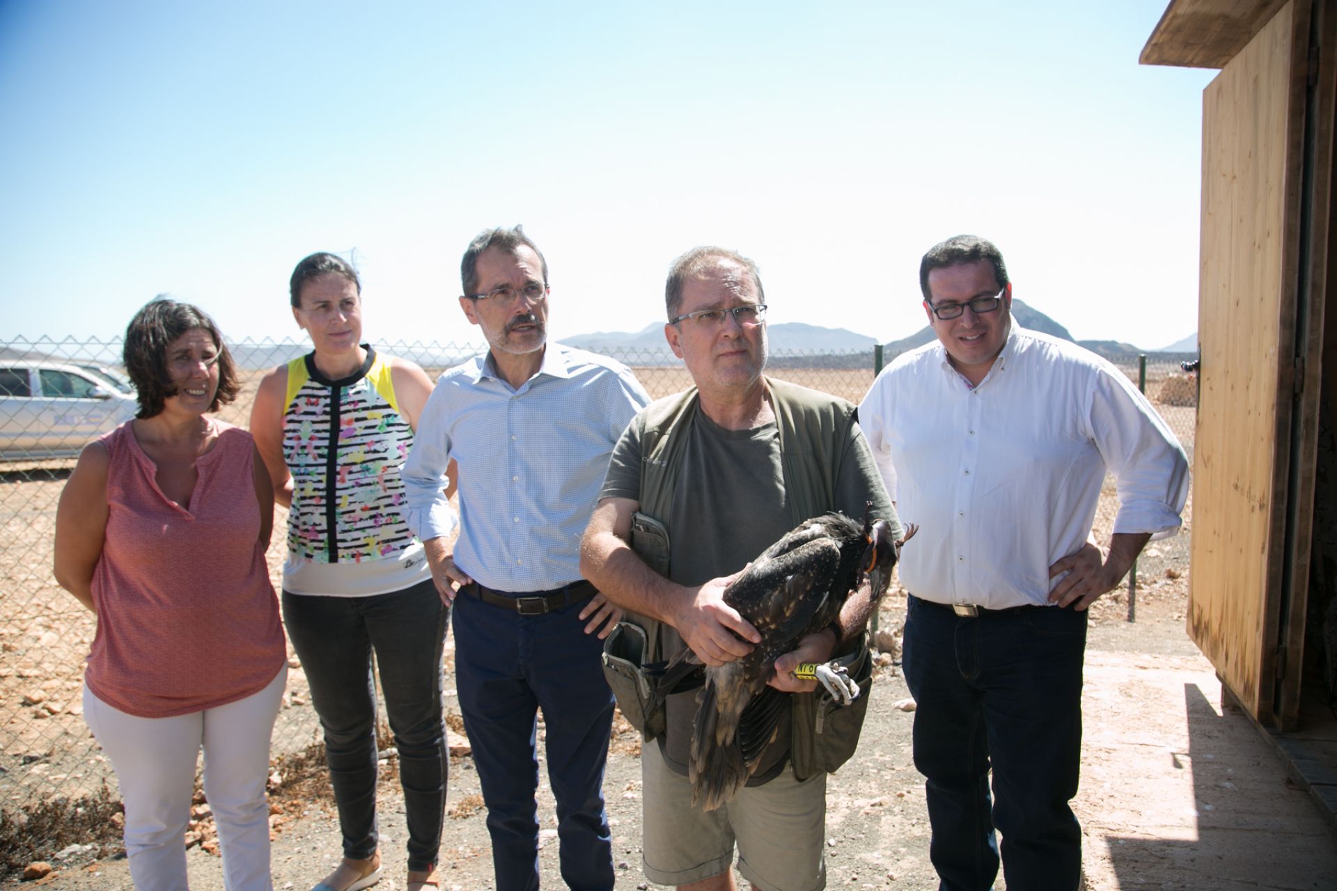 El presidente del Cabildo de Fuerteventura, Marcial Morales, la viceconsejera de Medio Ambiente del Gobierno de Canarias, Blanca Pérez, la consejera de Medio Ambiente, Natalia Évora, presenciaron el inicio de este proceso de liberación. Los técnicos colocaron al ejemplar un emisor GPS, que permitirá a los científicos estudiar en todo momento sus movimientos, su comportamiento, el uso que hace del territorio y su interacción con otros guirres.