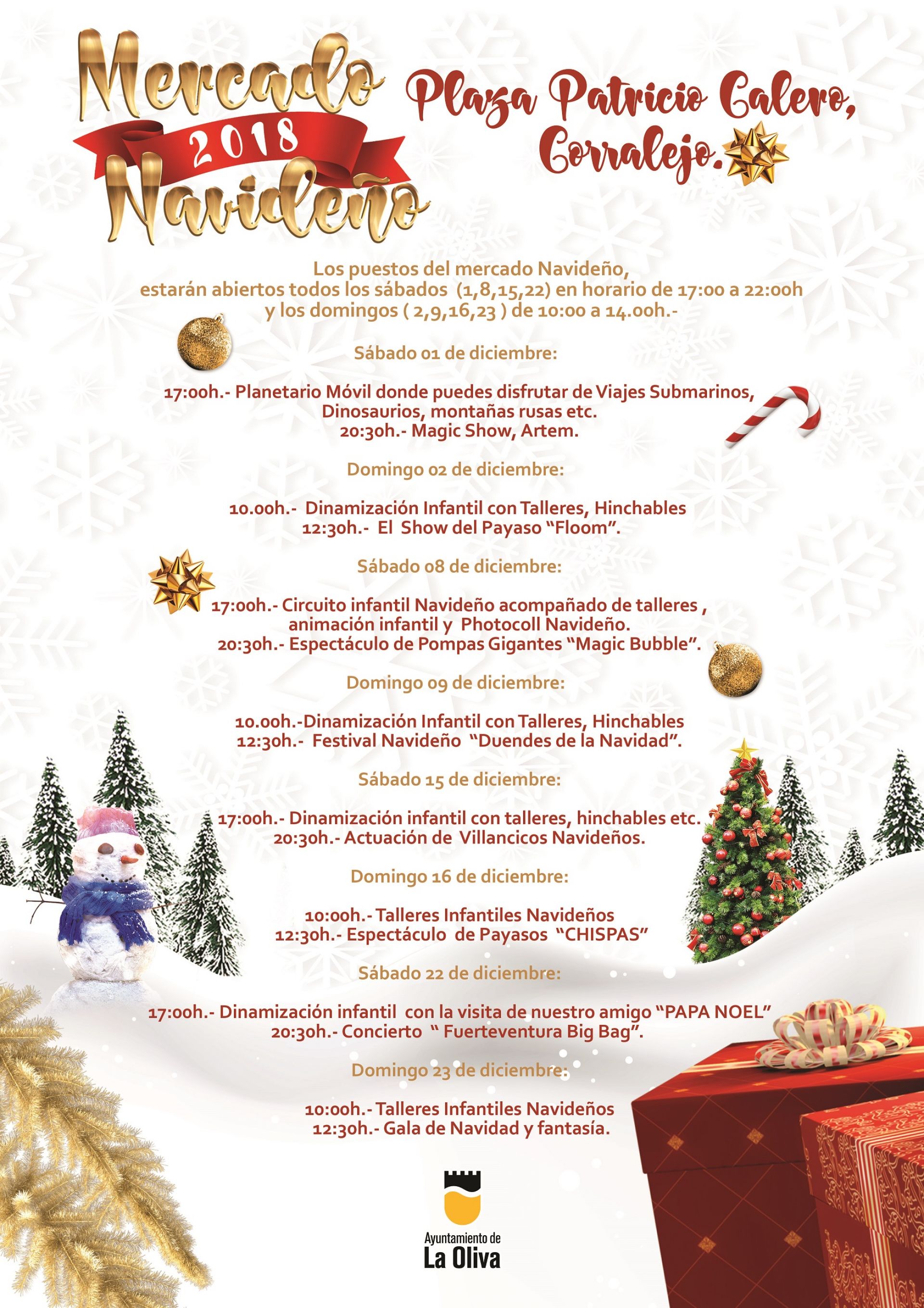 Las concejalías de Comercio y Cultura del Ayuntamiento de La Oliva se han coordinado para organizar el Mercado Navideño de Corralejo, que comienza este sábado día 1 y domingo 2 de diciembre, dando inicio a la programación de Navidad en el municipio.