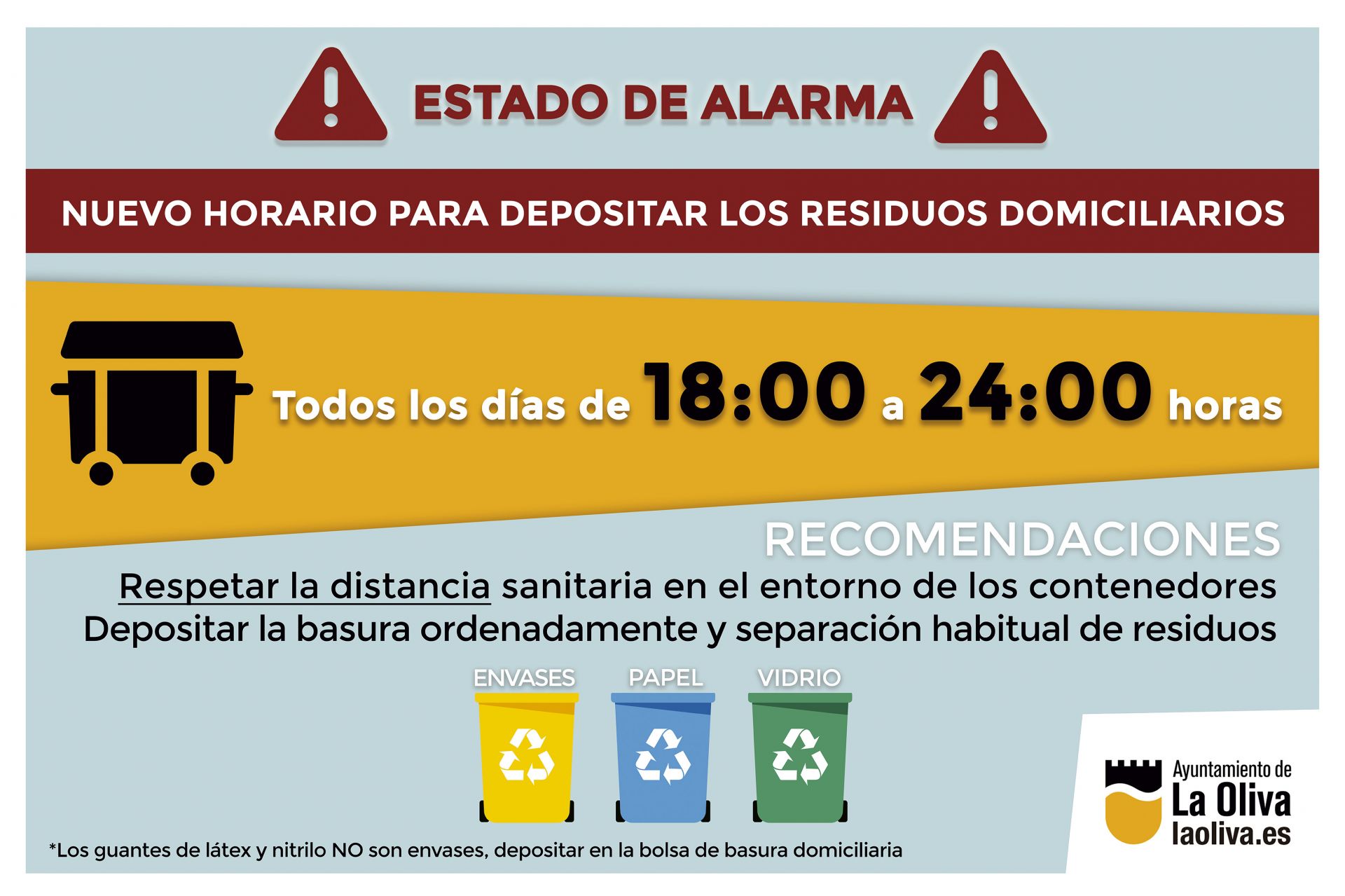 La Oliva, a 20 de marzo de 2020. El Ayuntamiento de La Oliva informa de la ampliación del horario para depositar la basura en los contenedores, que será de 18:00 a 24:00 horas a partir de hoy viernes, día 20 de marzo, todos los días durante el periodo en que permanezca decretado el Estado de Alarma.