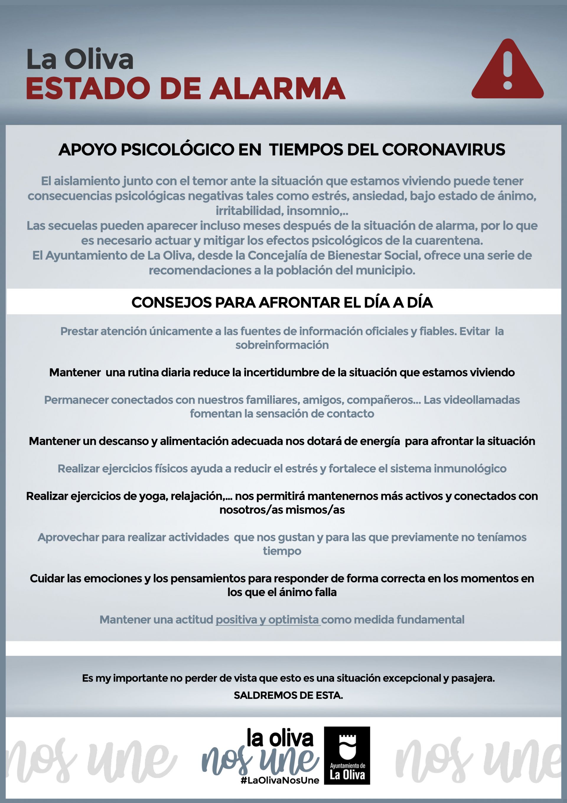 Para prevenir consecuencias psicológicas derivadas del aislamiento social, tales como estrés, ansiedad, bajo estado de ánimo, irritabilidad o, insomnio, los técnicos especialistas de la institución han trasladado una serie de consejos dentro de la campaña de información ciudadana "La Oliva Nos Une", y en el marco de otras muchas actuaciones que está llevando a cabo este departamento para atender a los vecinos y vecinas del municipio.