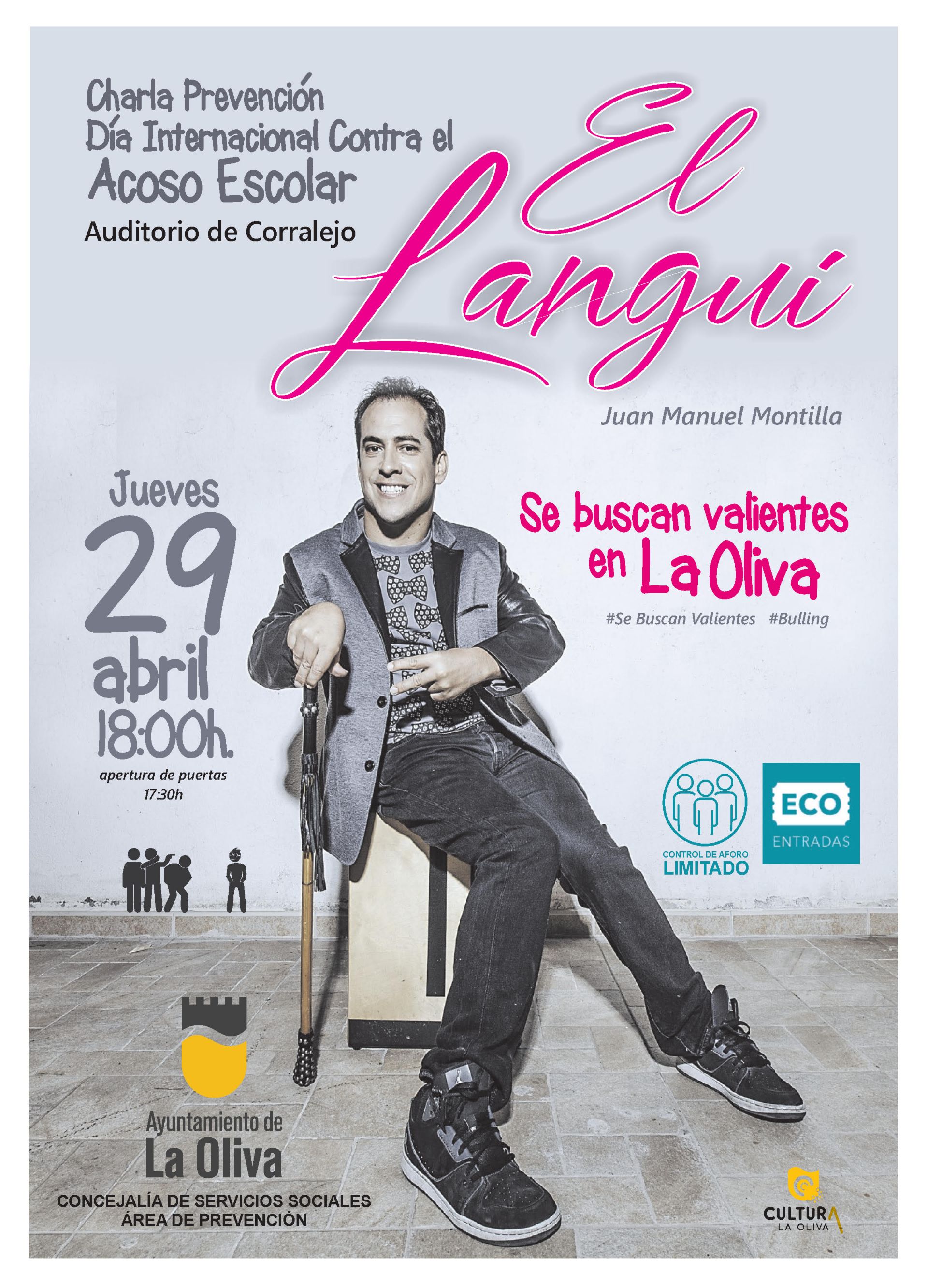 Desde el Ayuntamiento de La Oliva se han organizado una serie de conferencias que serán impartidas por Juan Manuel Montilla, Langui. El objetivo de las conferencias “Se Buscan Valientes en La Oliva”, es sensibilizar acerca de la importancia de erradicar el maltrato escolar a través de la prevención y la educación en los centros escolares, así como en el seno de las familias, poner en valor que las víctimas del acoso que no están solas e impulsar a que se decidan a denunciar a sus maltratadores ante la dirección del colegio, sus familias o un especialista. Además de concienciar a los testigos que presencian el abuso para que denuncien la situación y no se conviertan en cómplices silenciosos de estas situaciones.