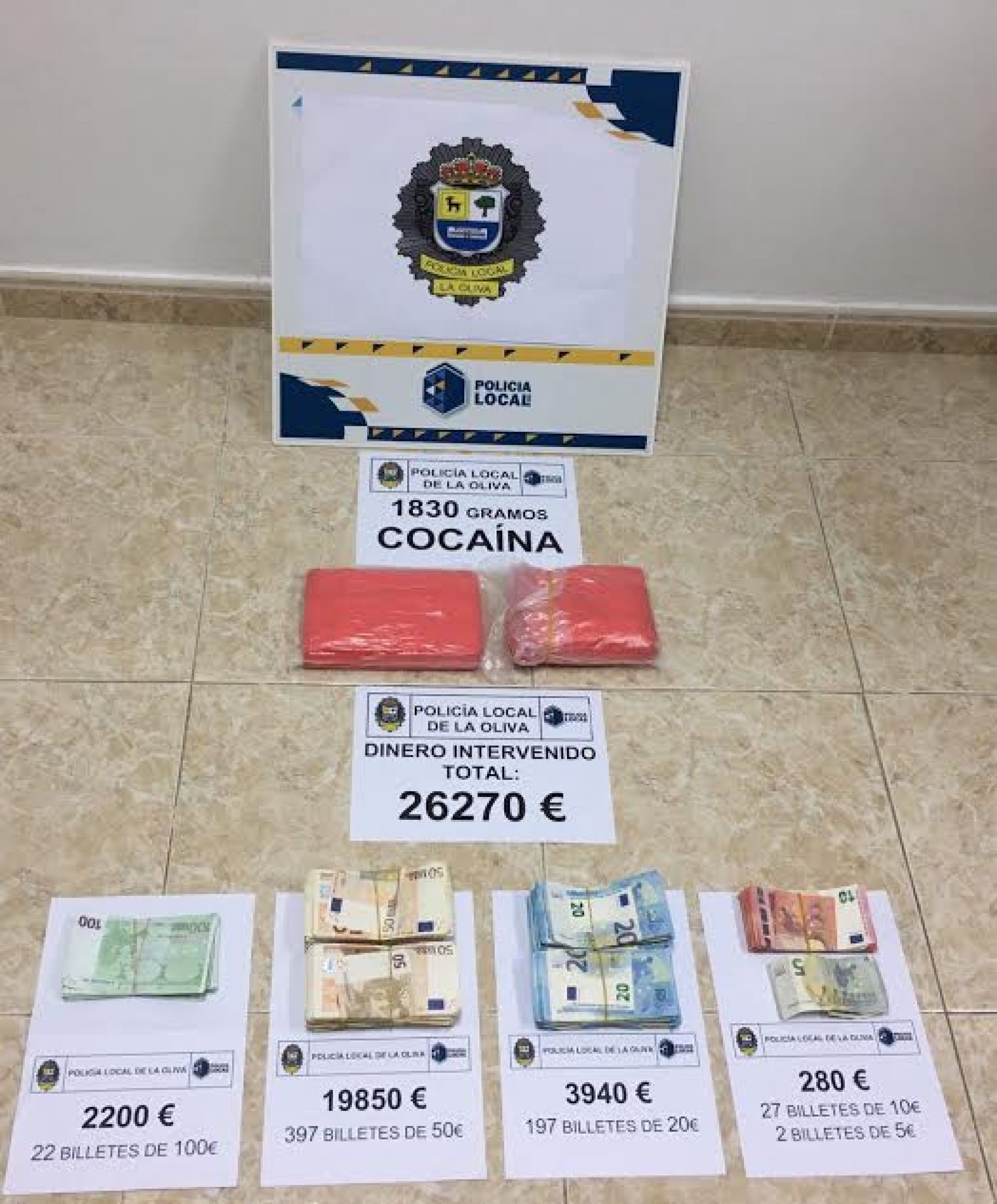 Realizado el recuento del dinero, resulta incautado un total de 26.270 euros. En relación a la droga, uno de los paquetes que estaba abierto contenía 830 gramos de cocaina y el otro paquete un contenido 1 kilogramo, de manera que el total de lo incautado asciende a 1,830 kilogramos, que podría alcanzar un valor de 700.000 euros en el mercado.