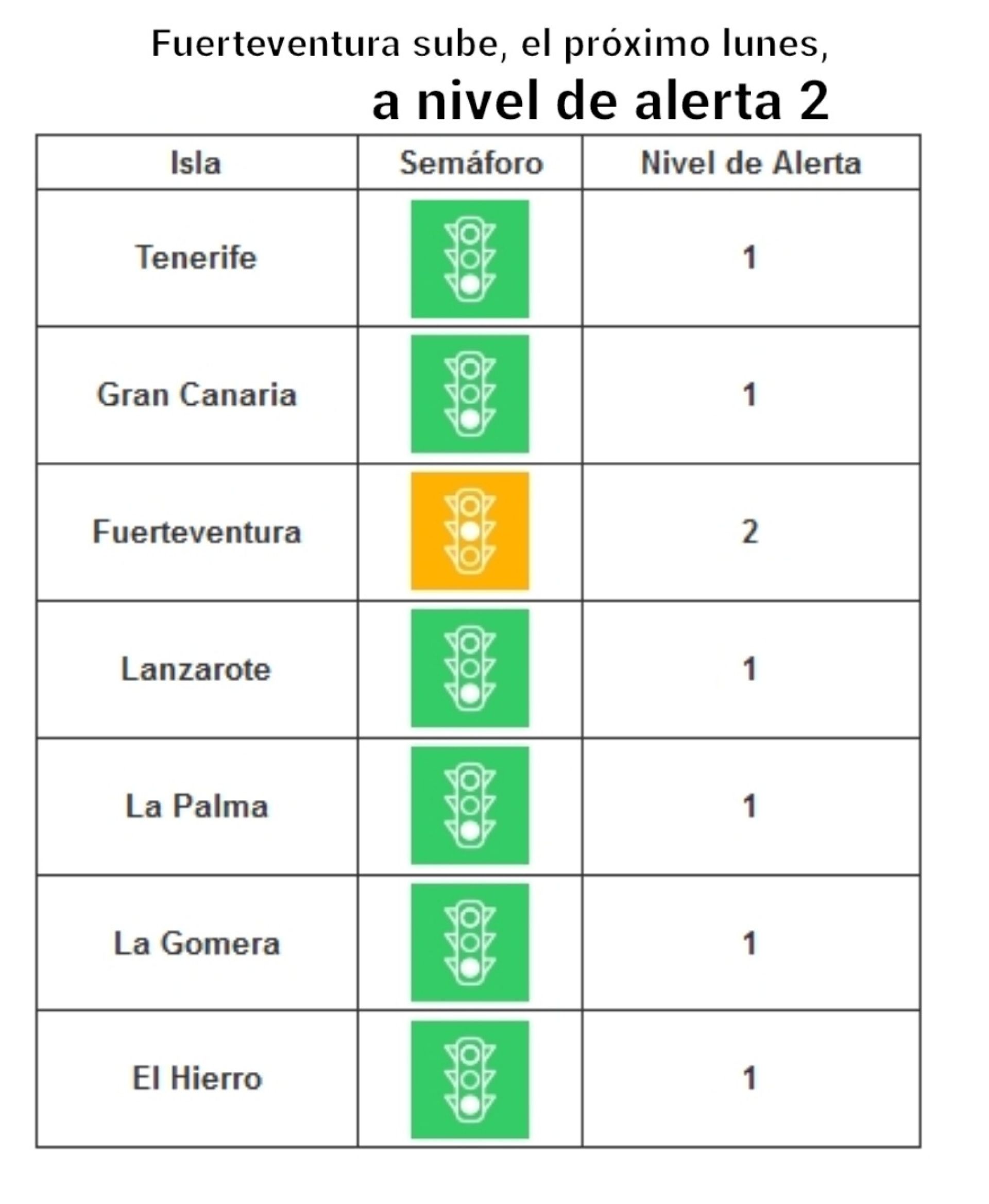 La Consejería de Sanidad del Gobierno de Canarias actualizó este jueves los niveles de alerta sanitaria tras el informe epidemiológico de la Dirección General de Salud Pública, con datos consolidados a 10 de noviembre, sobre la evolución de los indicadores sanitarios por COVID-19, que pasan a la isla de Fuerteventura a nivel de alerta 2, mientras que el resto de las islas continúan una semana más en nivel de alerta 1, identificado con el “semáforo verde”.