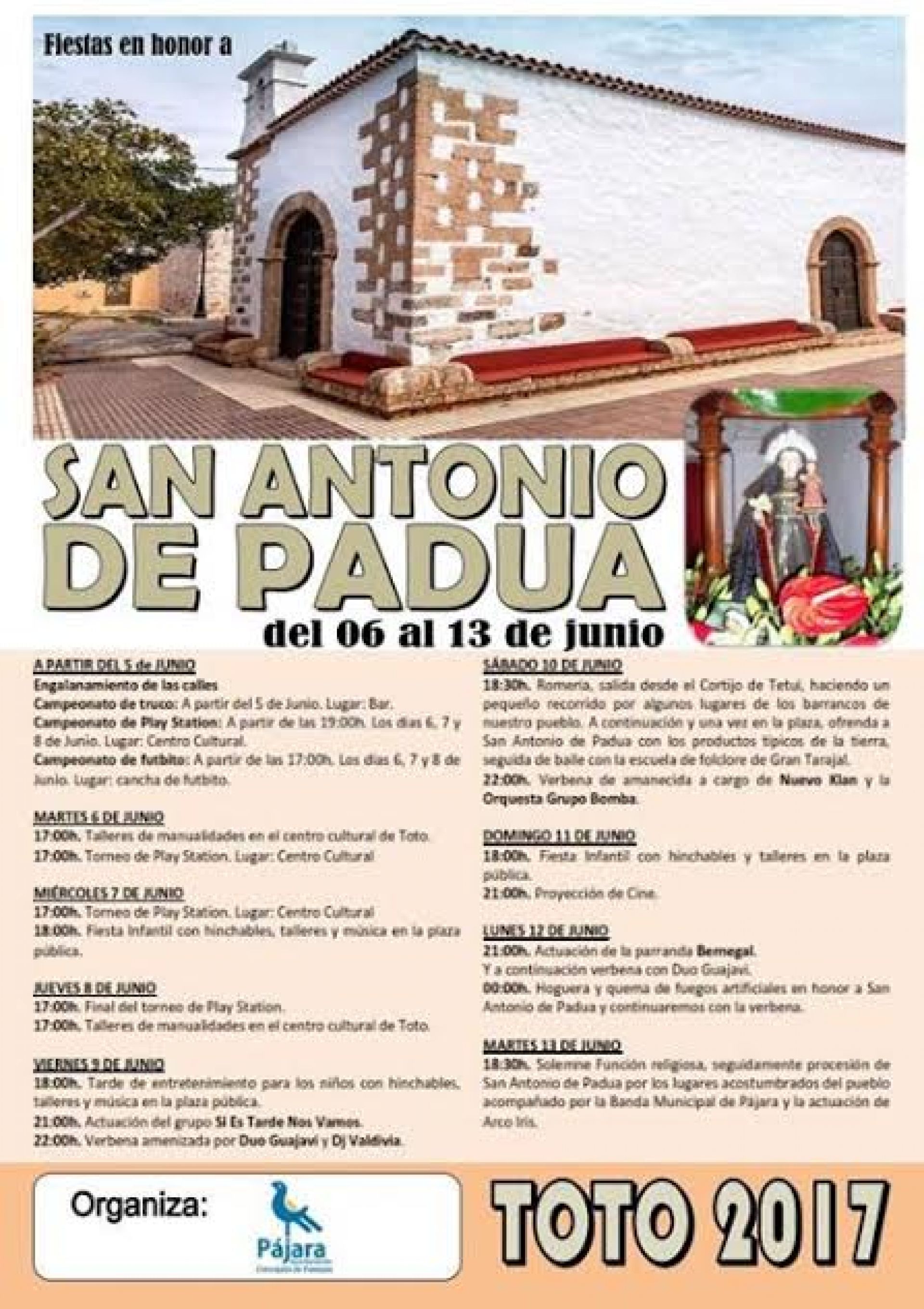 La localidad de Toto celebra a partir de mañana, 6 de junio, sus Fiestas en Honor a San Antonio de Padua, con un extenso programa de actividades organizado por la Concejalía de Festejos del Ayuntamiento de Pájara. El programa incluye actos tan destacados como la romería del sábado, día 10, o la procesión del martes, 13 de junio.