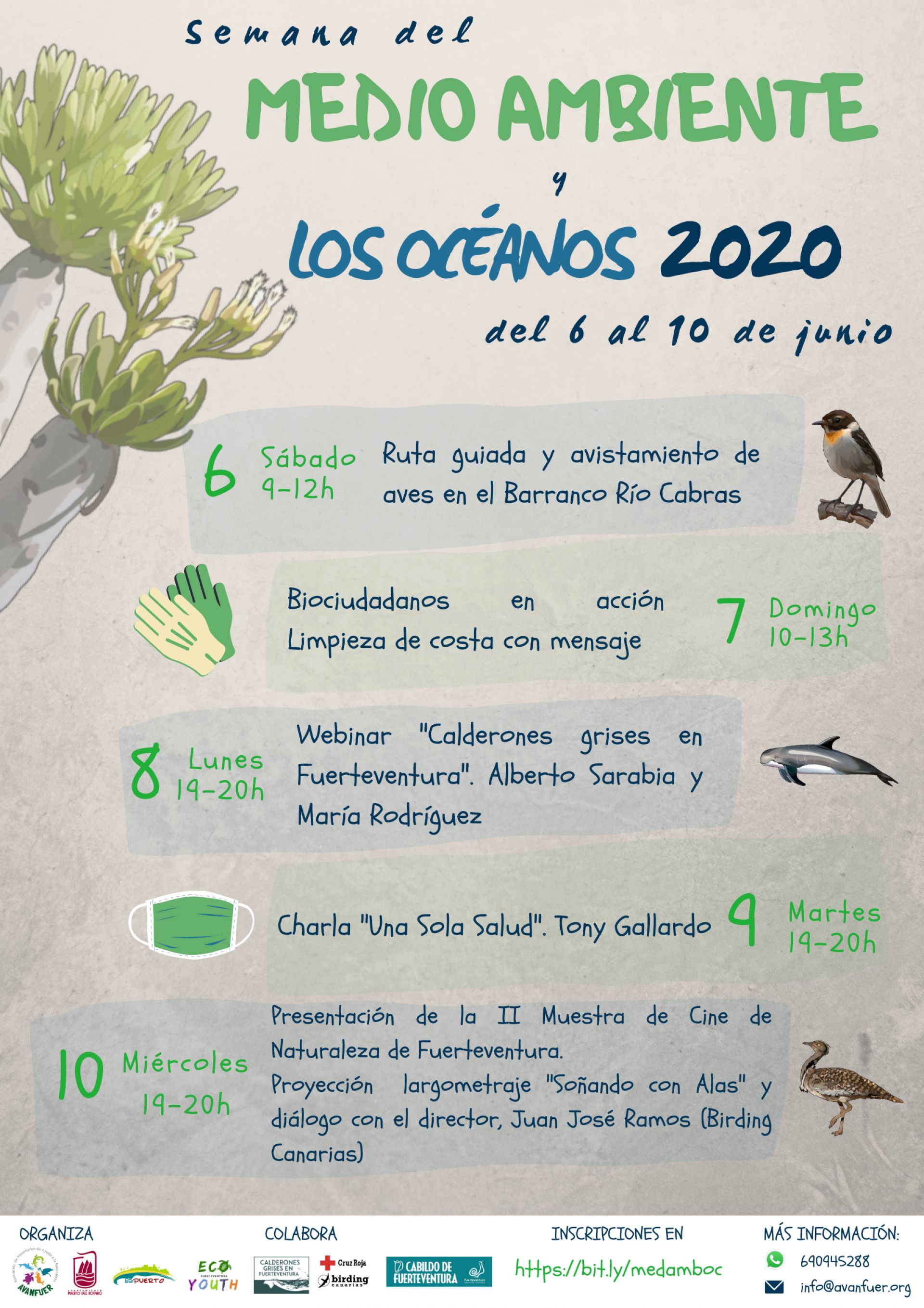 Este año, respetando el luto oficial por todas las víctimas del COVID-19, la organización ha decidido no festejar el Día Mundial del Medio Ambiente que se celebra institucionalmente cada 5 de junio y comenzar las actividades, en cambio, a partir del sábado 6 de junio, cuyo día estará destinado a dar a conocer el barranco Río Cabras, con un avistamiento de aves y una ruta guiada de 9.00 a 12.00 horas.