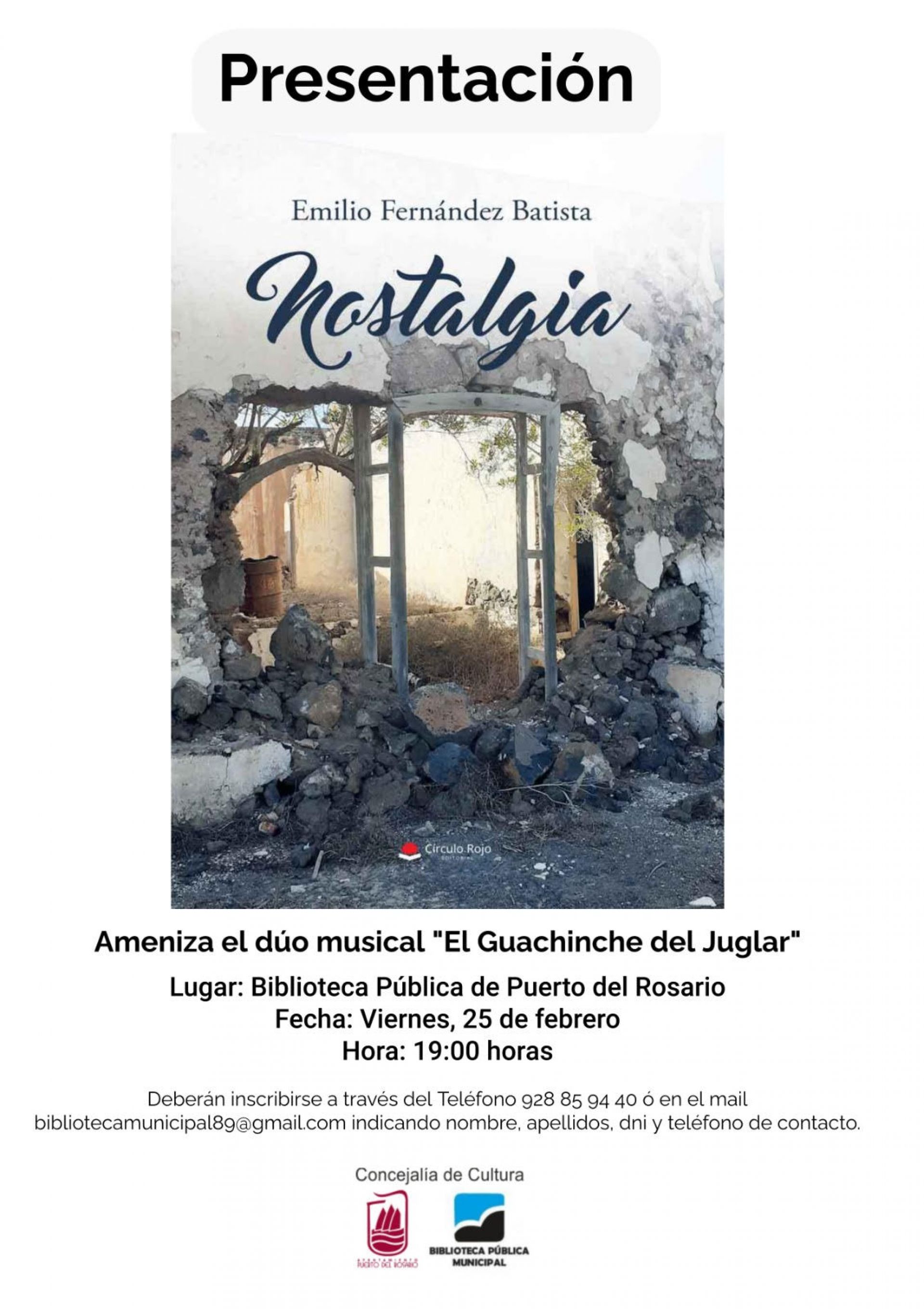 El escritor Emilio Fernández Batista, vecino del municipio de Tías, de la hermana isla de Lanzarote, presentará su séptimo libro titulado ‘Nostalgia’ el próximo viernes, 25 de Febrero, a las 19.00 horas, en la Biblioteca Municipal de Puerto del Rosario. La actividad ha sido organizada por la Concejalía de Cultura del Ayuntamiento capitalino.