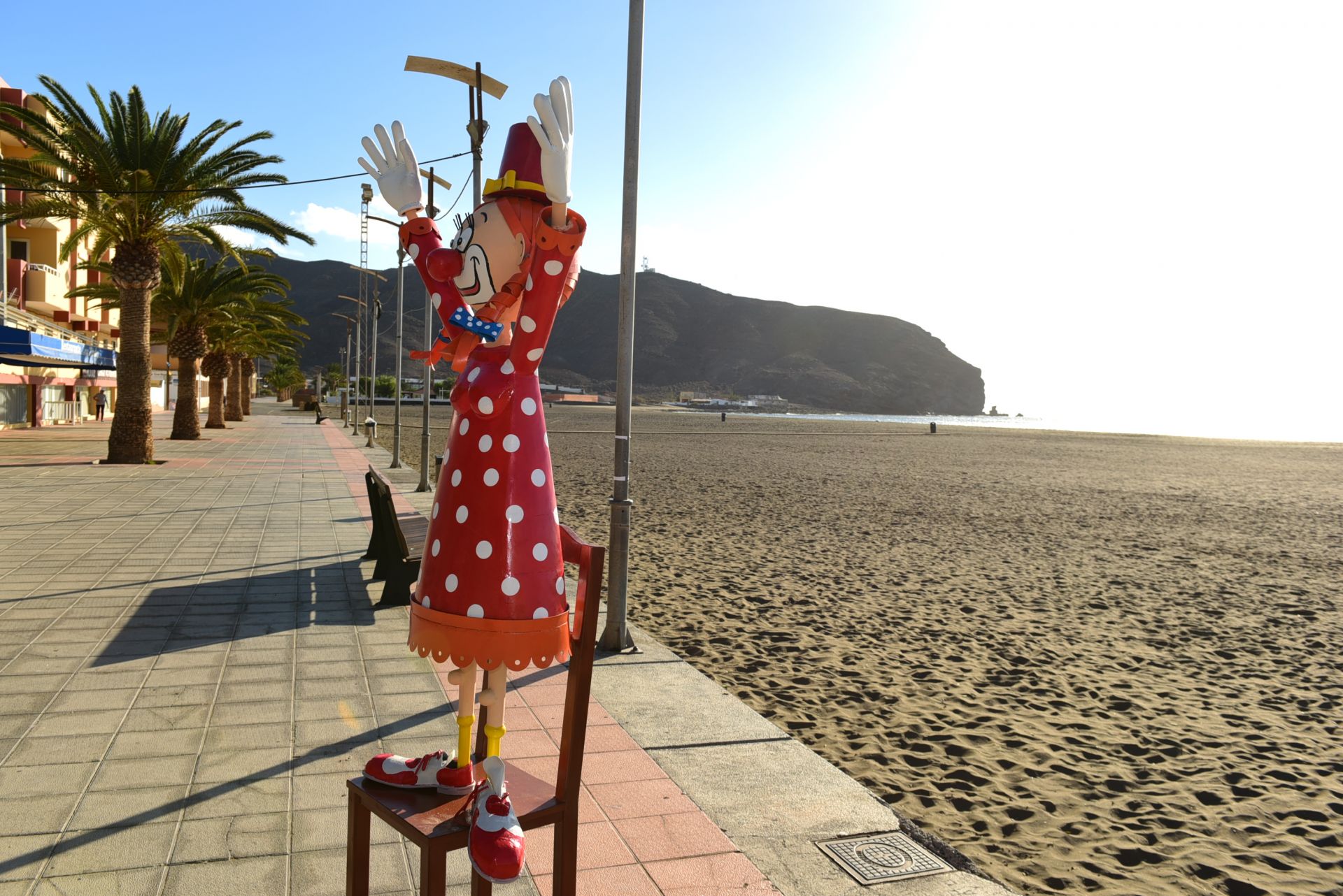 El Parque de la Avenida Paco Hierro de Gran Tarajal se ha cubierto de identidad ‘Tran Tran’ tras la colocación de la escultura de la Payasa “Chanita”. Este espacio ya había comenzado a cambiar su imagen durante las últimas semanas, después de decorar con lunares rojos y blancos las farolas y bancos, en clara referencia al tradicional Festival Internacional de Payasos ‘Tran Tran’.